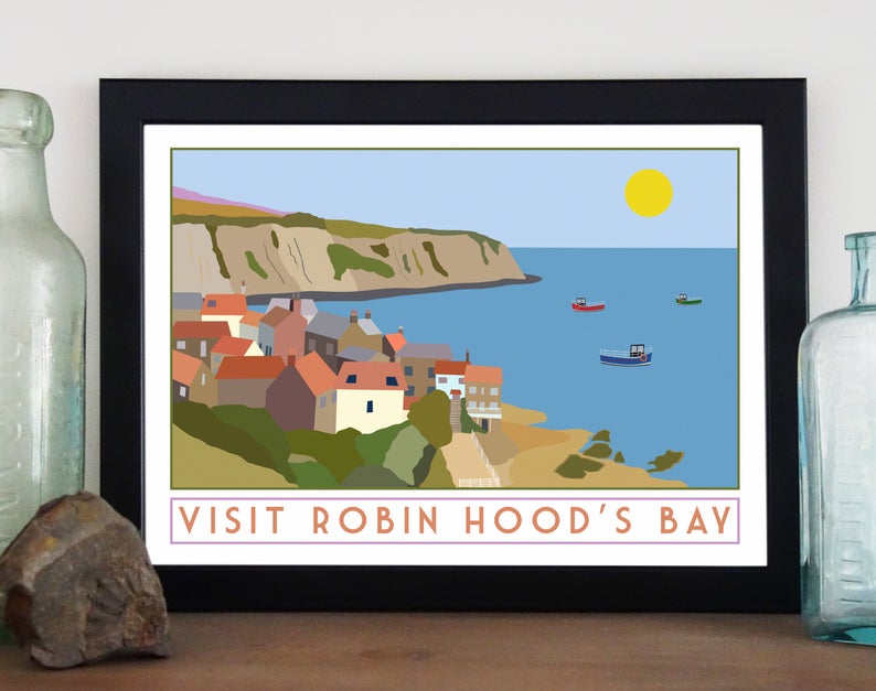 The picturesque town of Robin Hood's Bay features on this travel poster. Sandy beaches, fossil hunting and hidden cobbled streets make this a favourite place to visit for many people and it would make an ideal gift for anyway who loves this part of Yorkshire.