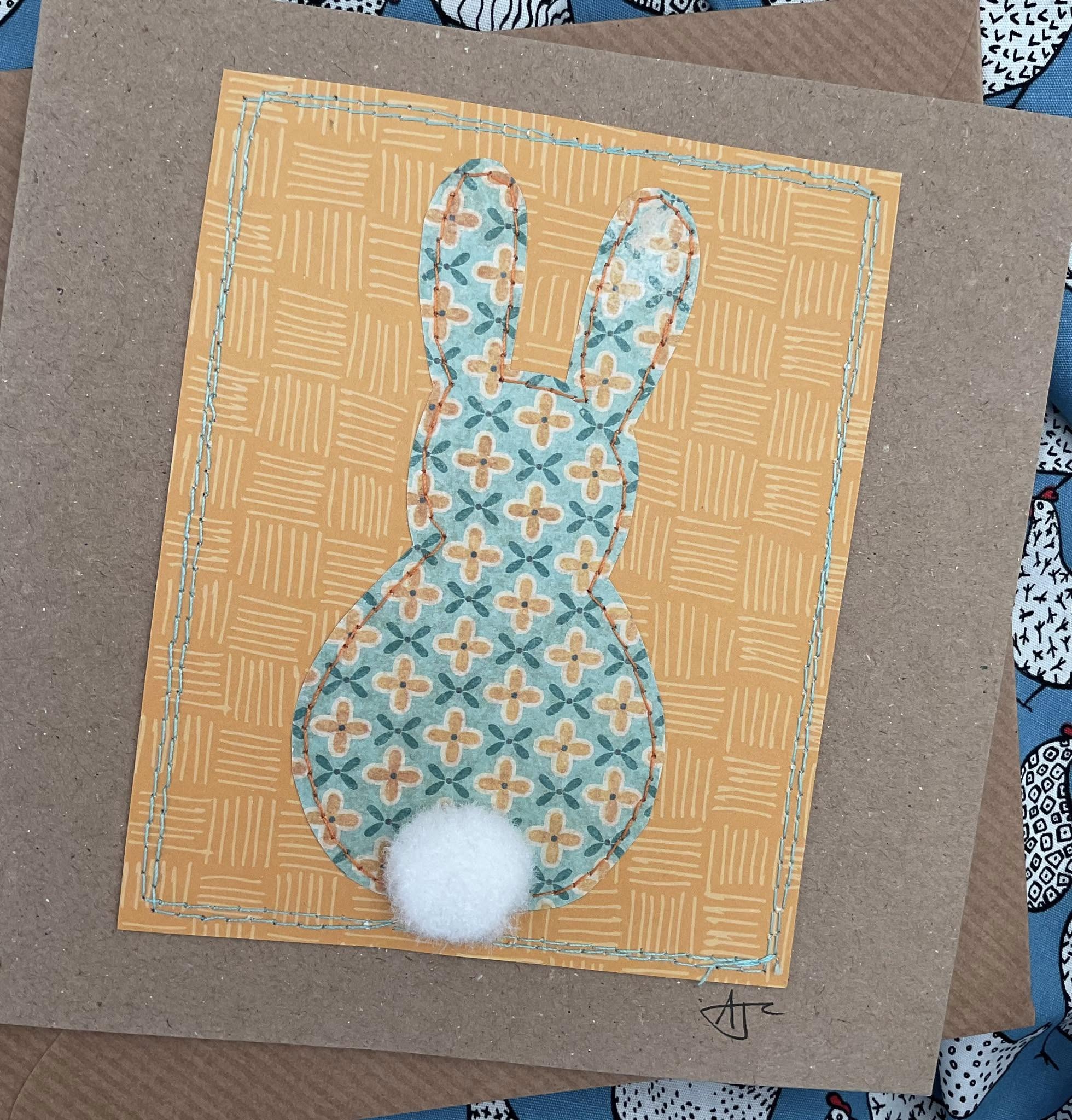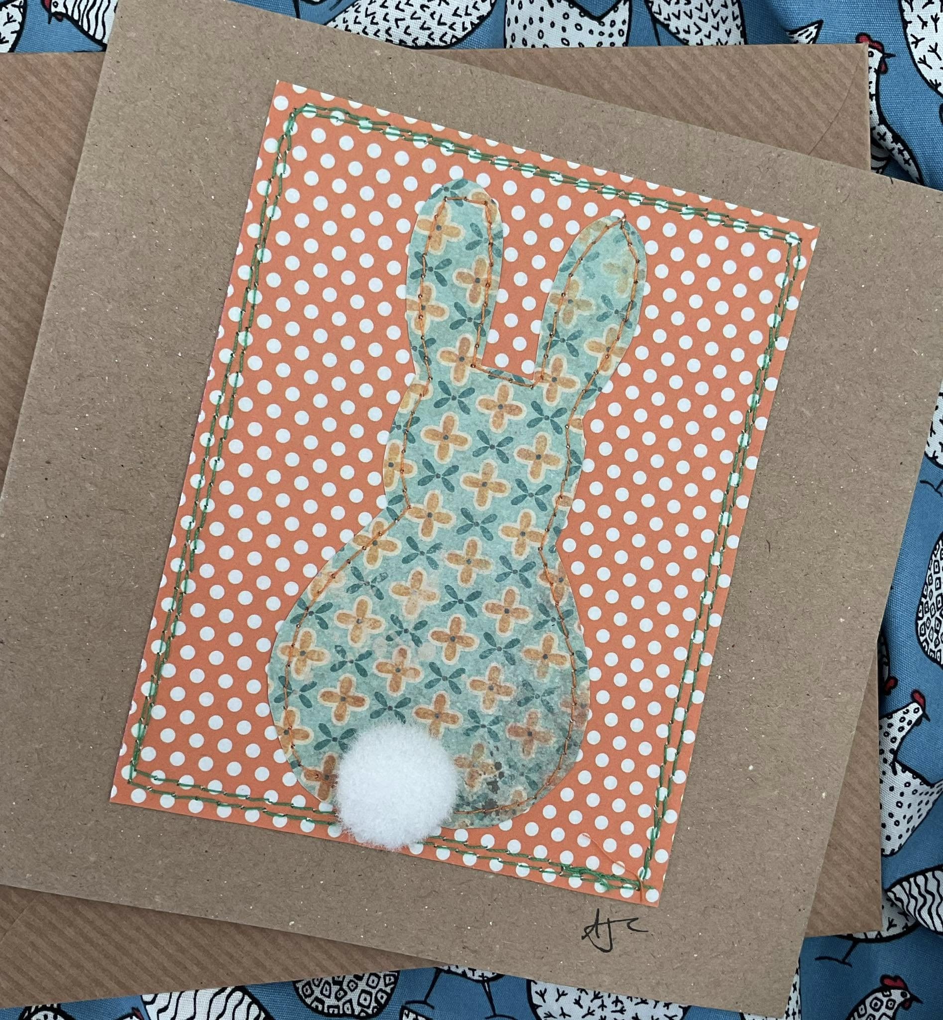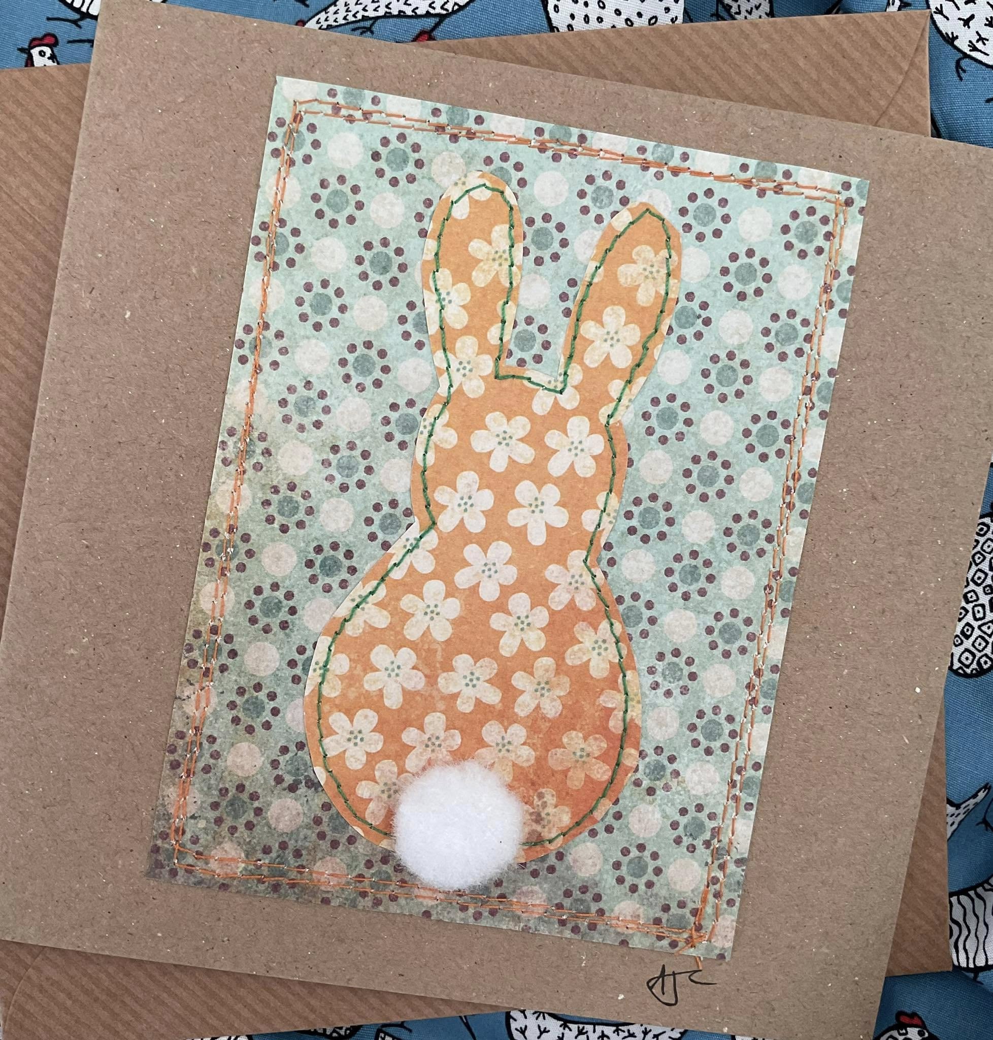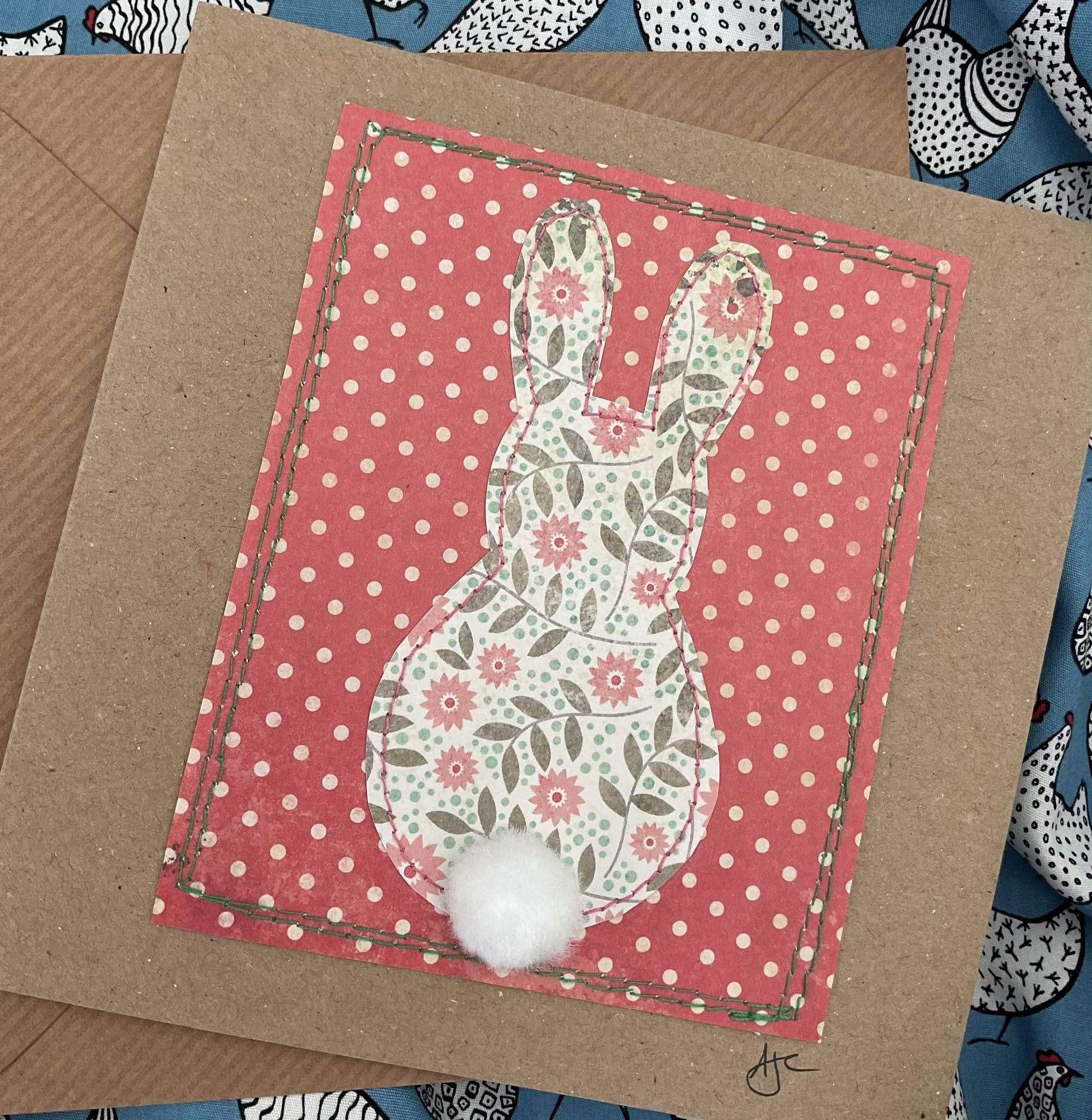Handmade by OHC Maker Quirky Thread Art, this is a floral fabric collage greetings card with machine stitching of a cute Easter bunny complete with fluffy pom pom tail!