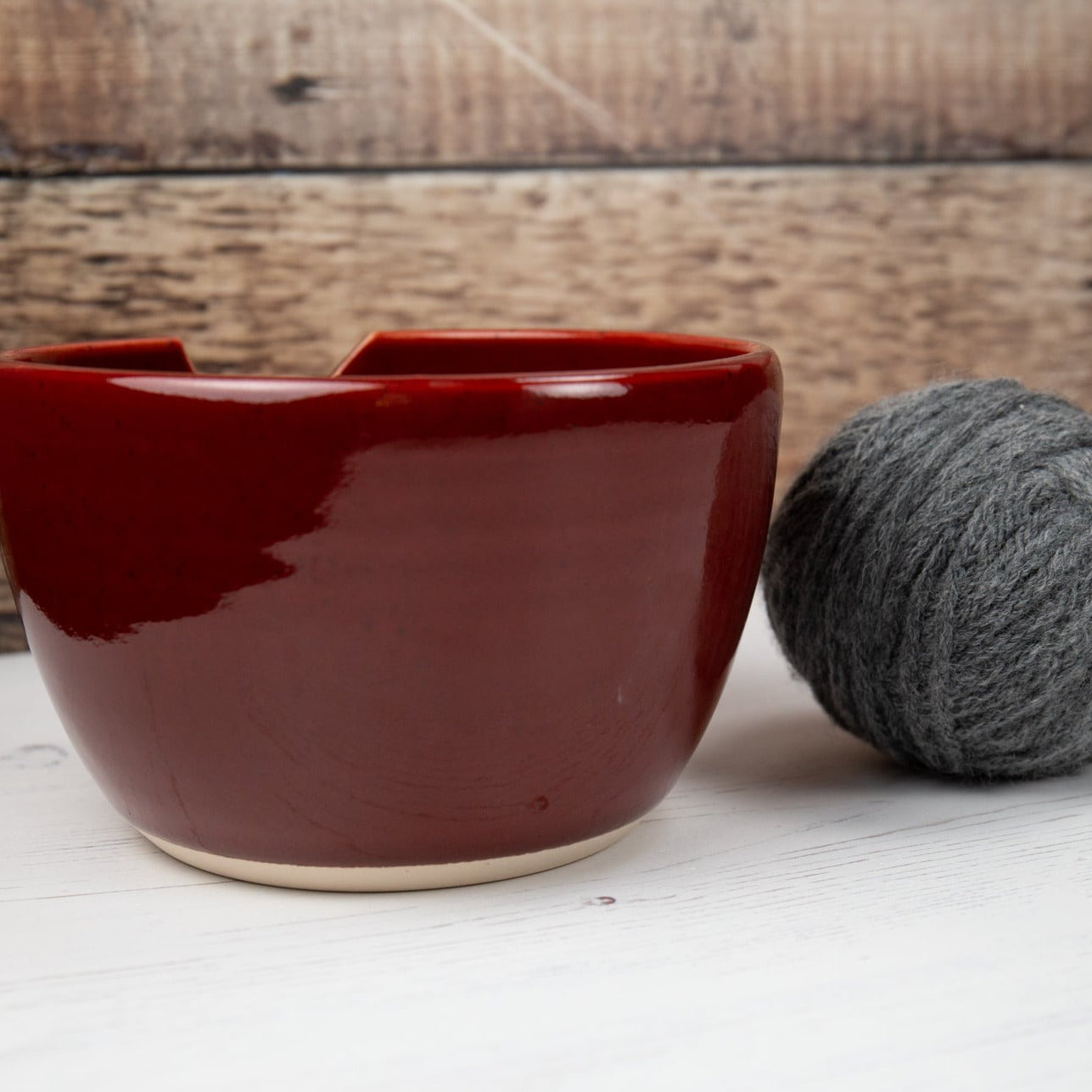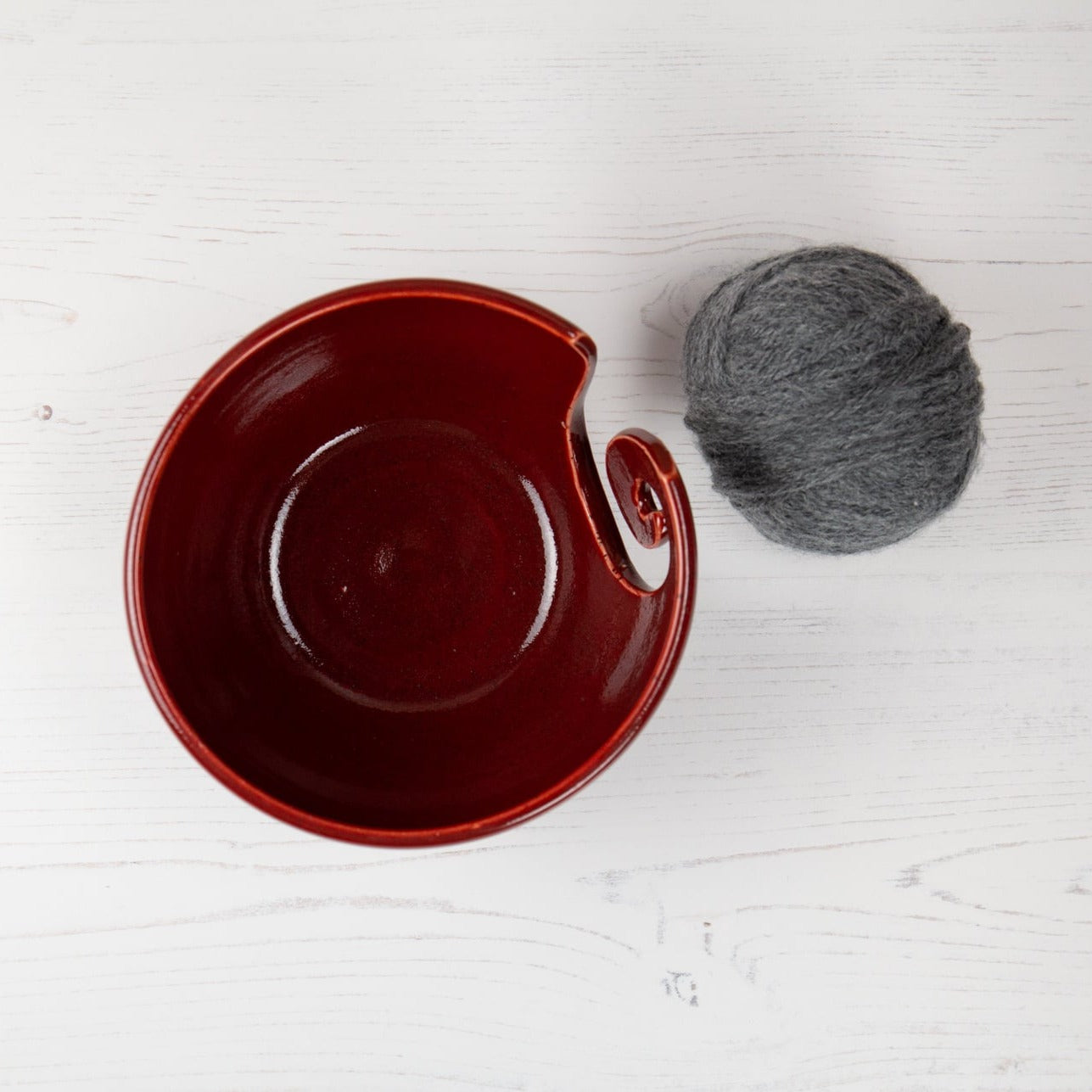 This yarn bowl was hand thrown on a potter’s wheel using strong white stoneware clay. A spiral to thread your wool through was carved out before the bowl dried. Glazed in a slightly speckled deep red glaze.