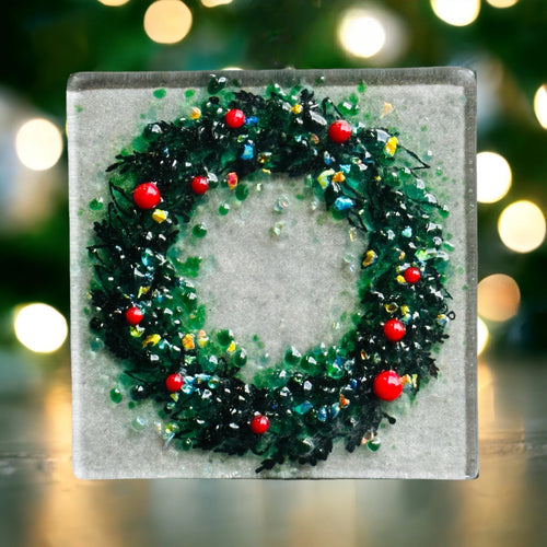 Christmas Wreath - Glass Tea Light holder - Fused Glass - Twice Fired