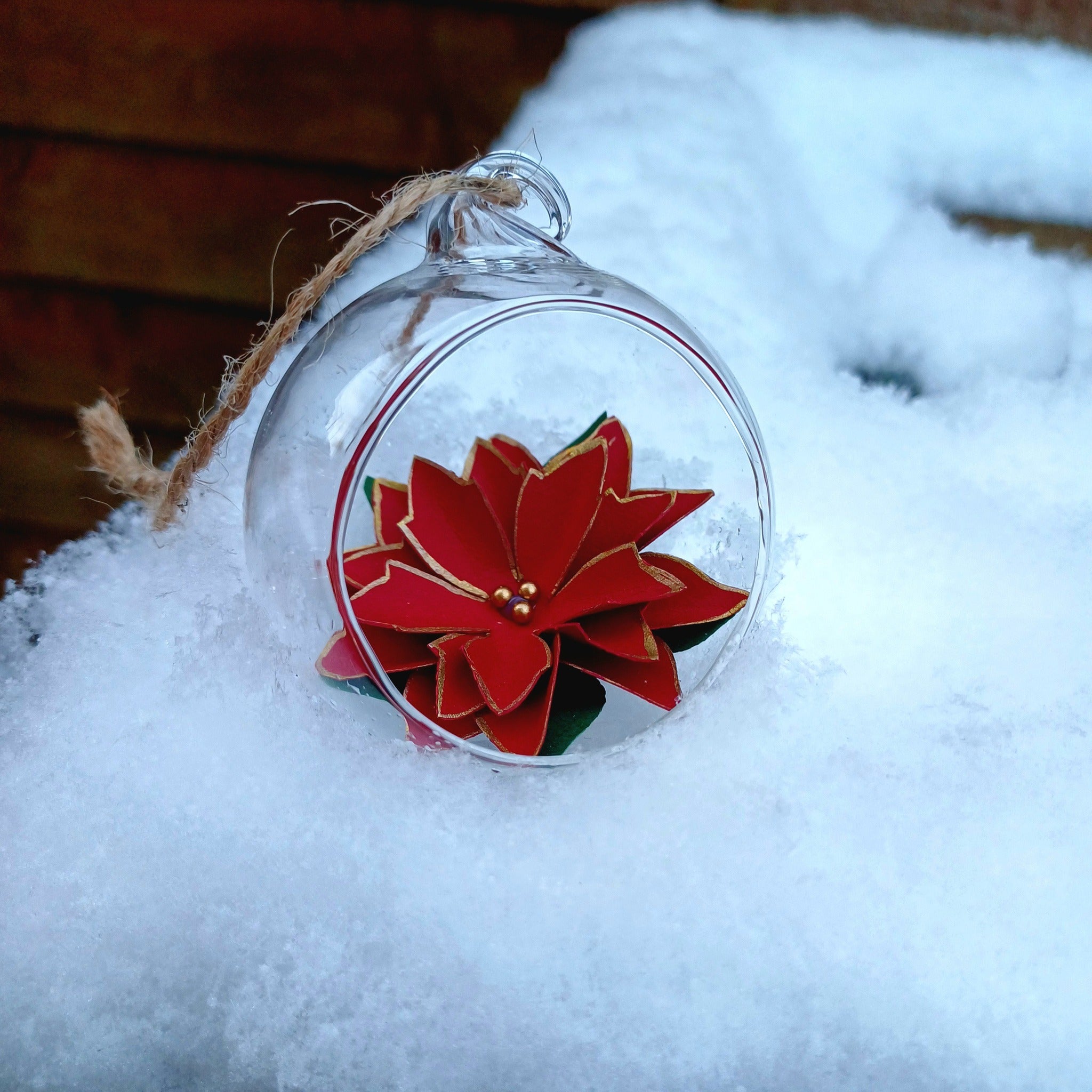 A perfect addition to a your tree this festive season is a handcrafted Poinsettia within an open glass bauble.