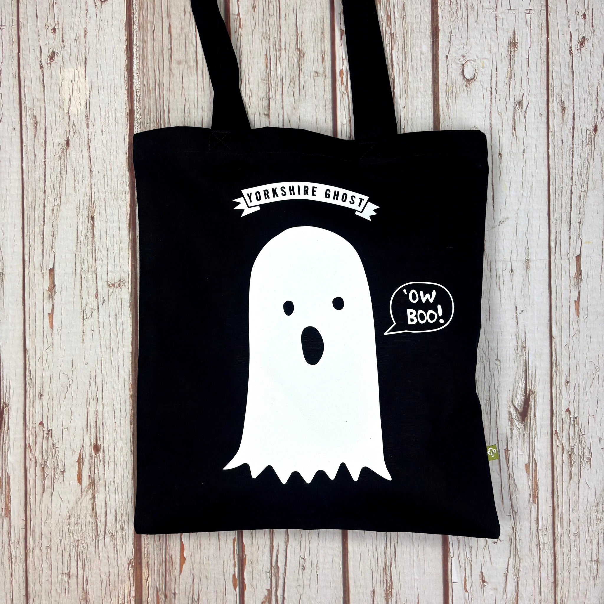 The design is their Yorkshire Ghost illustration in whit flock on a rust or black tote. Ow Boo!