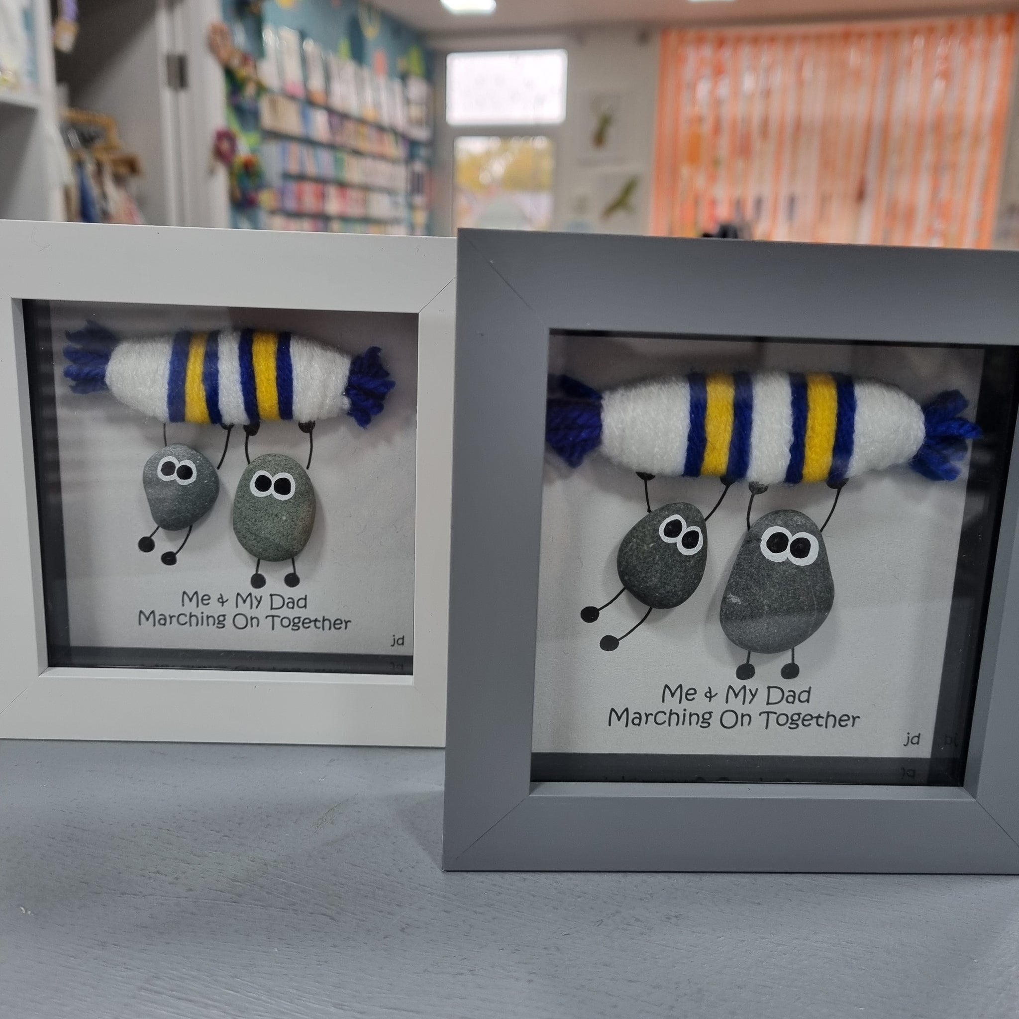 The perfect gift for a Leeds Utd supporting dad! A quality glass fronted box frame in white featuring a pebble dad holding a Leeds United scarf and his child swinging from it in excitement!