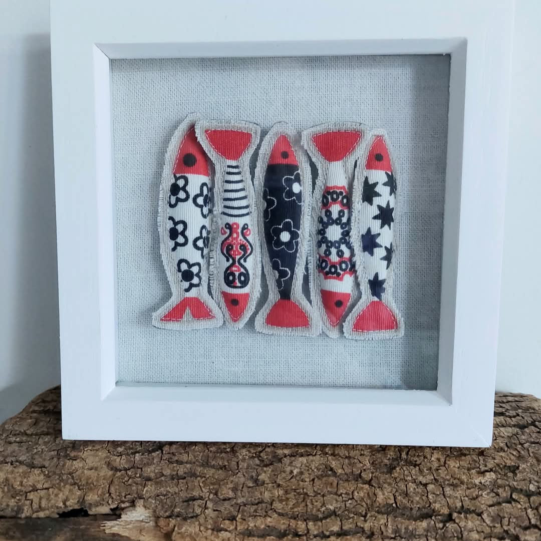 Handmade by OHC Maker Quirky Threads Art, this is 'Packed In', a white box frame with 5 fabric fish, creating an ace 3d effect.