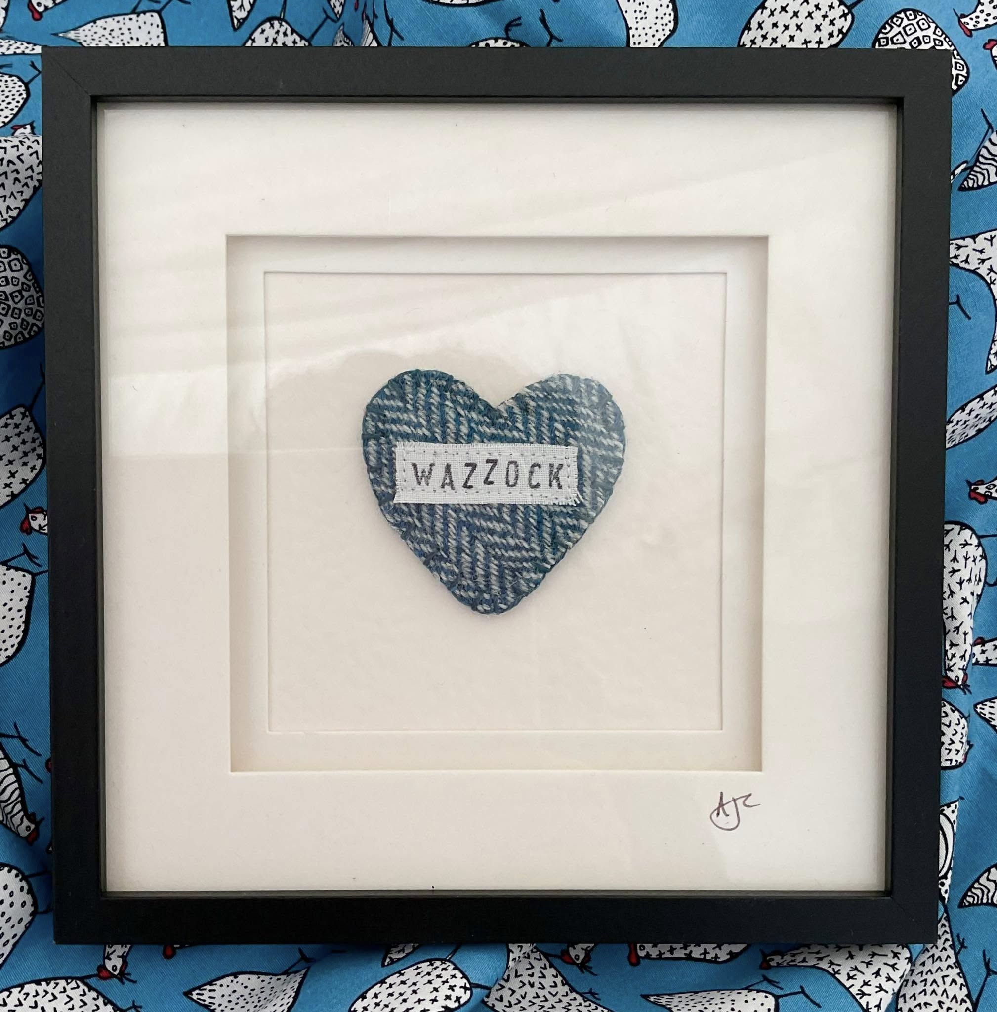 Yorkshire Tweed heart with hand stamped “WAZZOCK” - in a deep black frame, approx 17cm square.