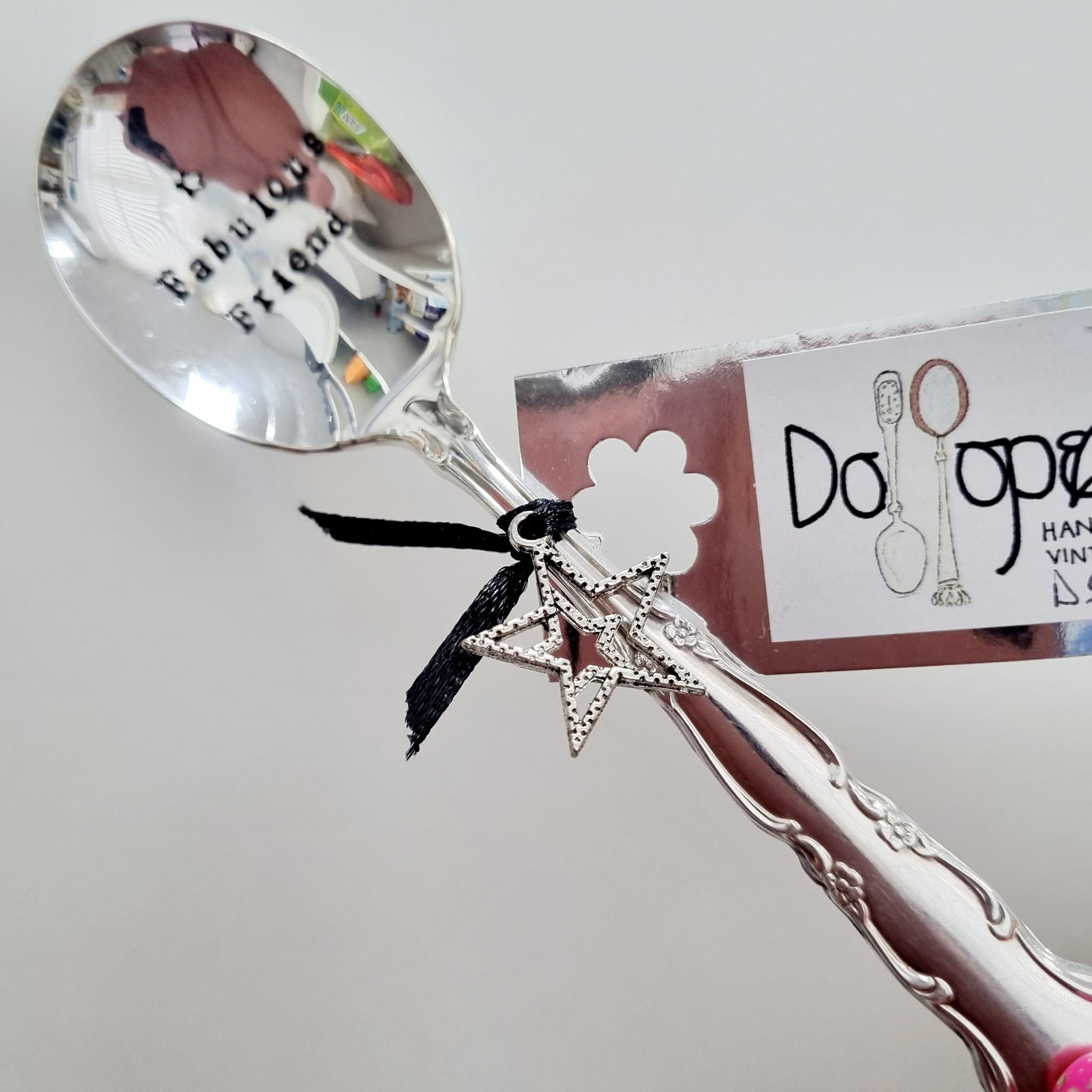 This one is stamped with 'Fabulous Friend' with a stamped star and it is a vintage silver plated dessert spoon with a delicate pattern and shaped detail on the handle.