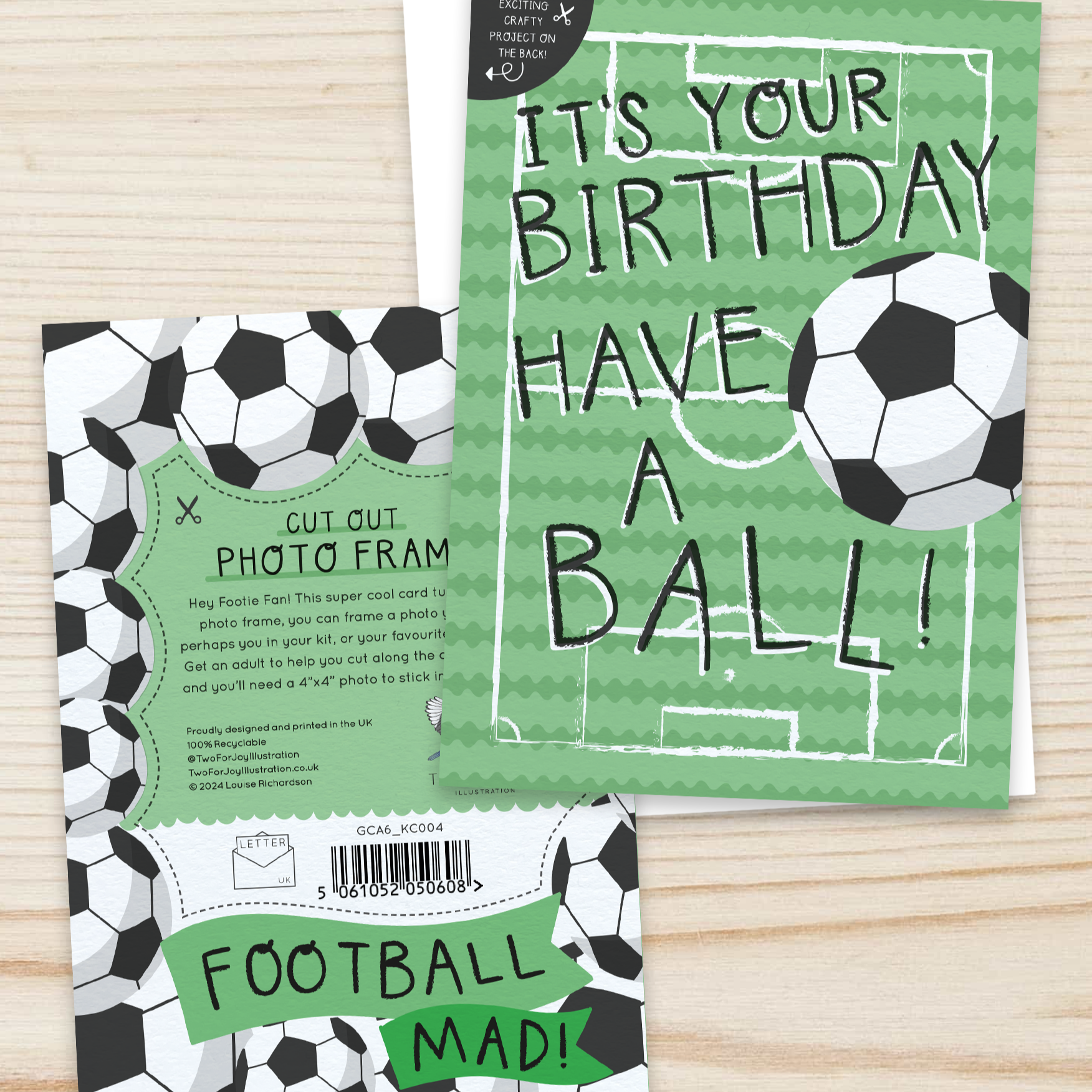 A two-in-one birthday card and crafty project, this cleverly designed card by Two For Joy Illustration is perfect for children who love the brilliant sport of football. The front features an illustrated football pitch, with wavy classic green pitch stripes and a lovely big football, with the wording ‘It’s your birthday, have a ball!’