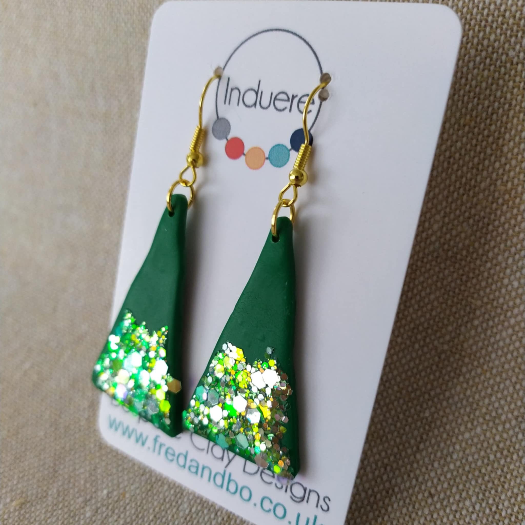 Green Polymer clay simple tree with irridescent glitter sparkleTree measures 4cm with gold coloured hook earring fittings.